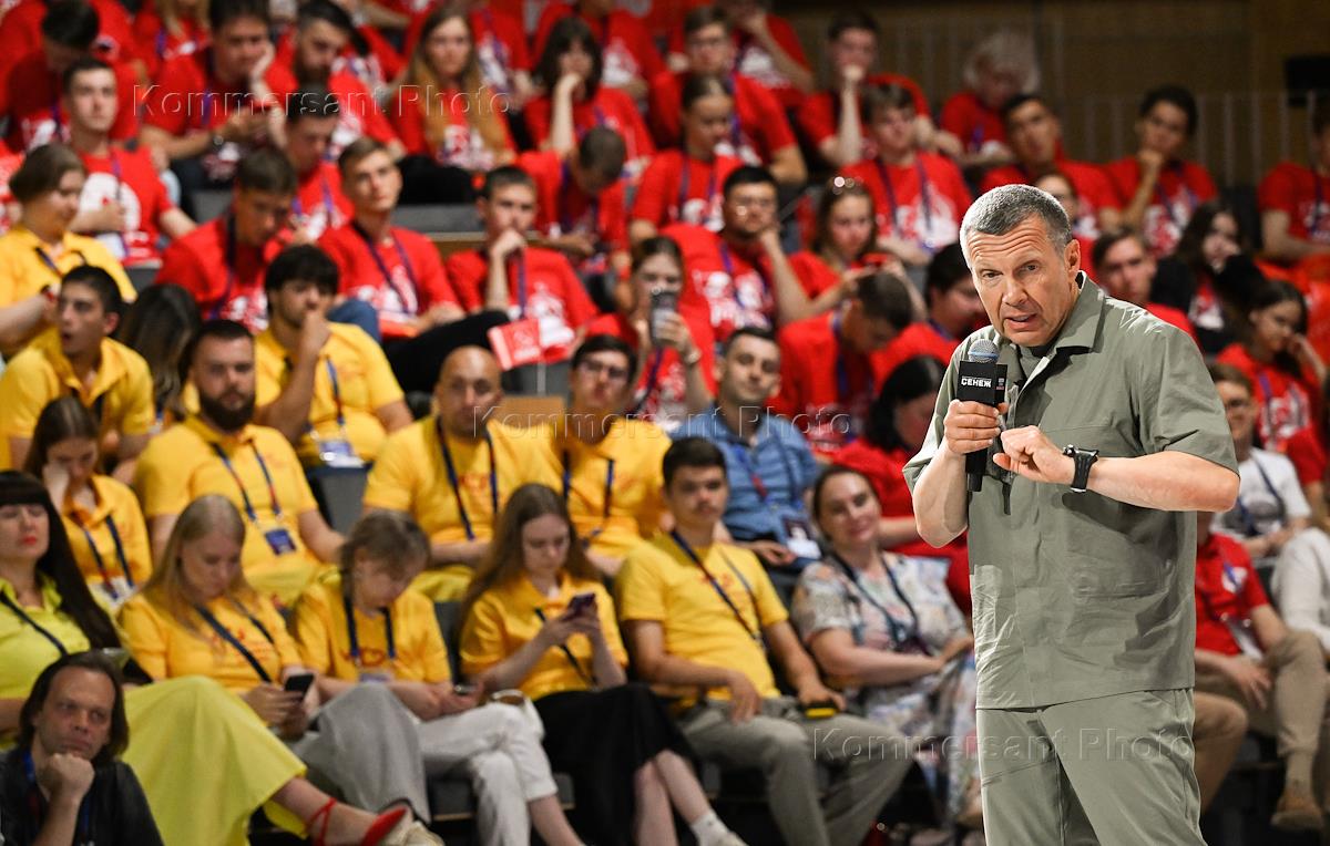 Всероссийский молодежный образовательный форум "Территория смыслов" в Мастерской управления "Сенеж". Межпартийные дебаты о политических вызовах будущего и будущем политических партий с руководителями парламентских объединений. Телеведущий Владимир Соловьев во время дебатов.