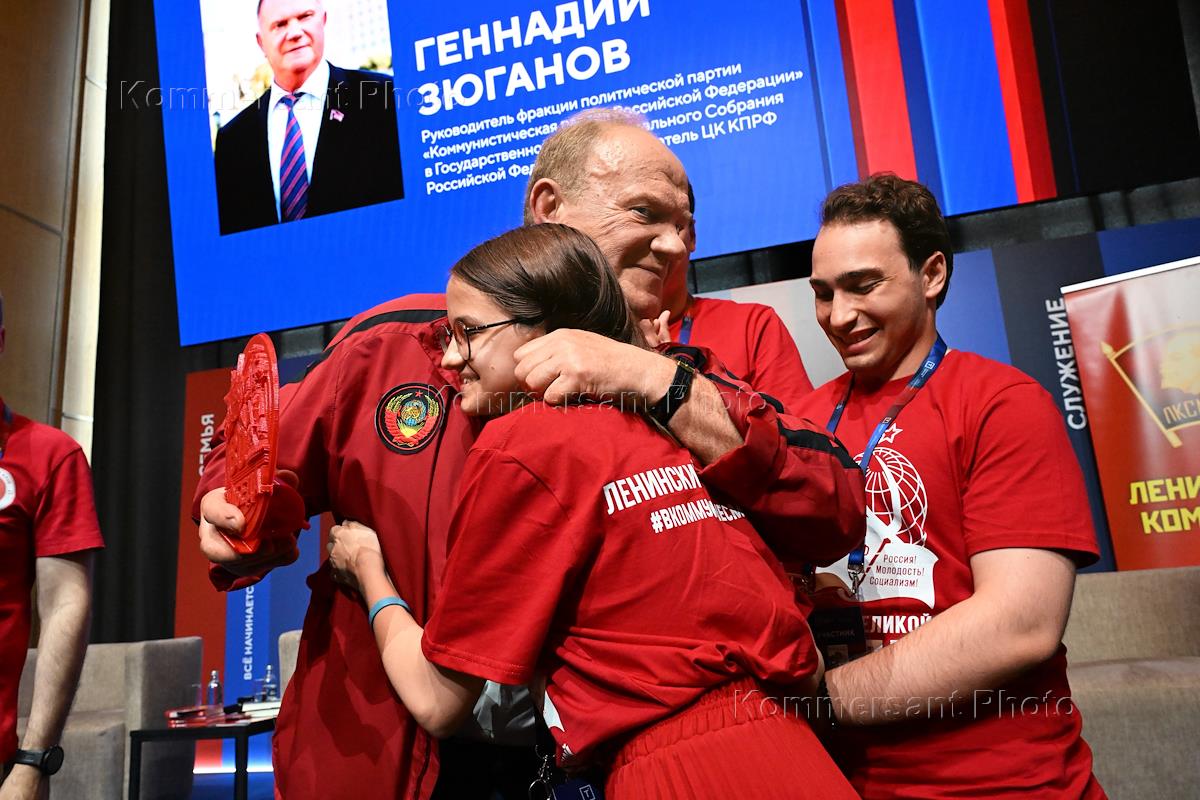 Всероссийский молодежный образовательный форум "Территория смыслов" в Мастерской управления "Сенеж". Слева направо: заместитель председателя комитета Государственной думы (ГД) России по защите семьи, вопросам отцовства, материнства и детства Мария Дробот, лидер КПРФ, руководитель фракции КПРФ в ГД России Геннадий Зюганов и первый заместитель комитета ГД России по безопасности и противодействию коррупции во время общения с участниками форума.