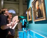 Выставка "К барьеру! Поединки и дуэли от Ахилла до Лифаря" в Николаевском зале Государственного Эрмитажа. Посетители на выставке.
