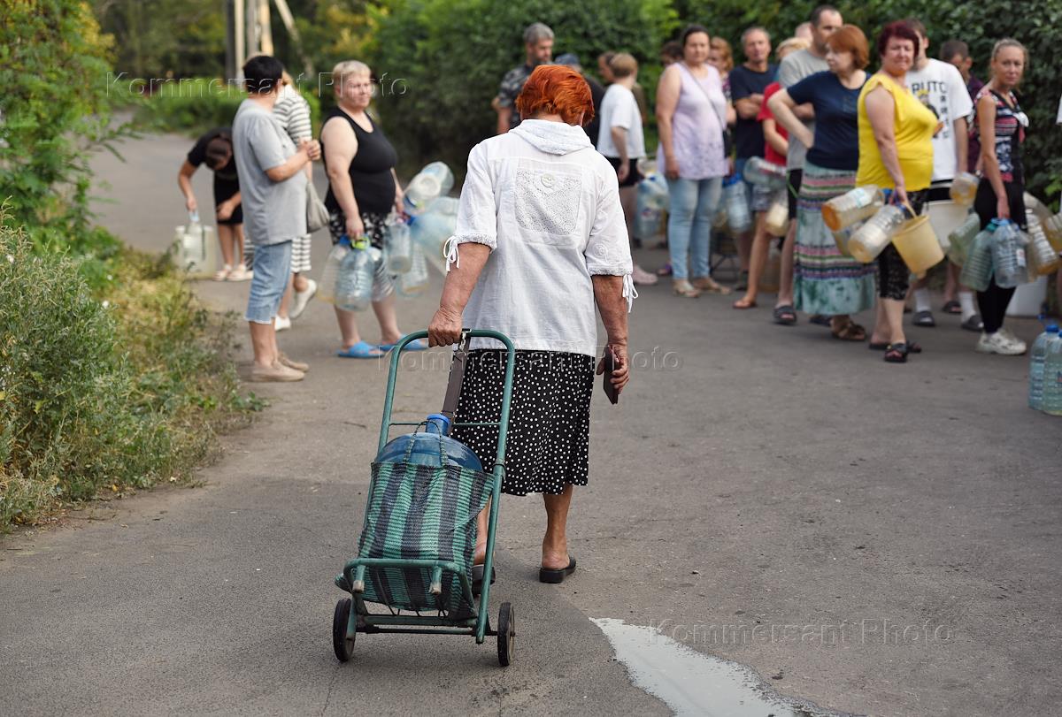 Ситуация с обеспечением населения водой в Кировском районе Донецка на фоне сложившейся ситуации с водоснабжением в регионе. Люди стоят в очереди за привозной водой с канистрами и пластиковыми бутылками.