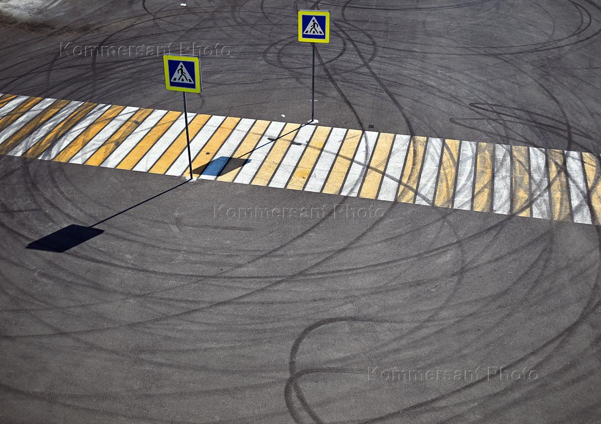 Жанровая фотография. Следы от автомобильных колес и зебра пешеходного перехода на площади.