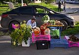 Виды Омска. Жанровая фотография. Женщина торгует свежими овощами на остановке общественного транспорта.