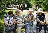 Виды Омска. Жанровая фотография. Пожилые женщины сидят на лавочке в парке во время празднования Дня города.