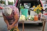 Жанровая фотография. Уличная торговля овощами, цветами и ягодами, выращенных на дачных участках.