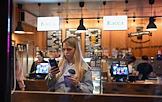 Жанровая фотография. Кофейня. Девушка с мобильным телефоном за столиком в кофейне.