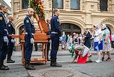 Праздничные мероприятия, посвященные 95-й годовщине создания Воздушно-десантных войск (ВДВ) России, на Красной площади. Участники Крестного хода из храма Пророка Божия Илии в Китай-городе до Лобного места на Красной площади.