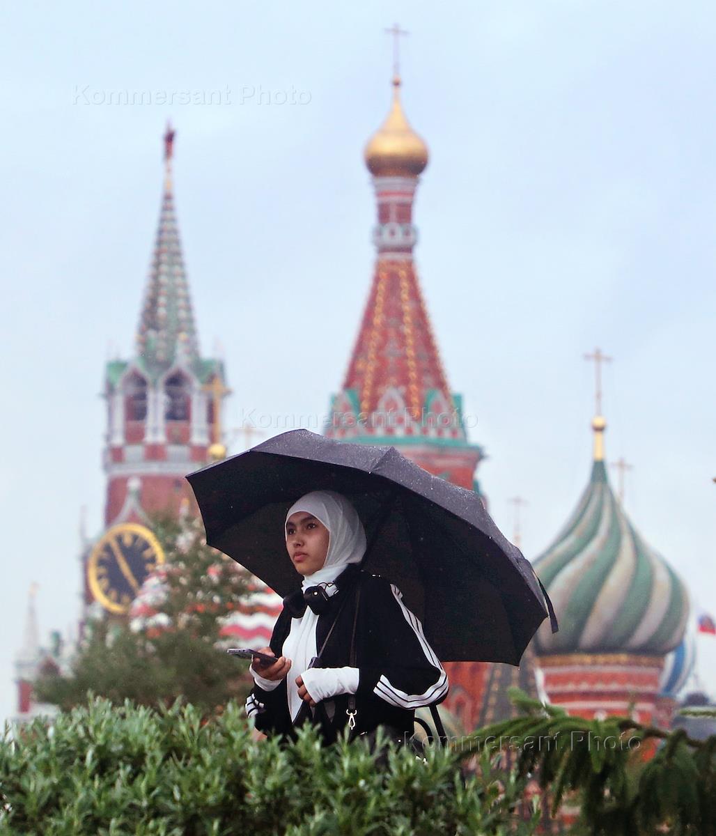 Виды Москвы во время дождя. Жанровая фотография. Туристы на Красной площади.