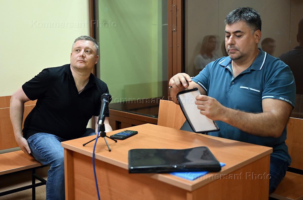 Заседание суда по делу бывшего сотрудника ФСО Дениса Резвова, обвиняемого в мошенничестве на несколько миллионов рублей, в 235 Гарнизонном военном суде. Бывший сотрудник ФСО Денис Резвов (слева) и адвокат Антон Голышев (справа) во время заседания суда.