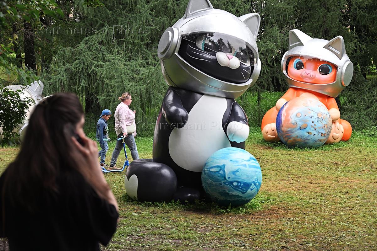 Форум-фестиваль "Территория будущего. Москва 2030" в парке 50-летия Октября. Футуристический кластер — прототип Москвы будущего. Арт-объект "Космокотики". Жанровая фотография.