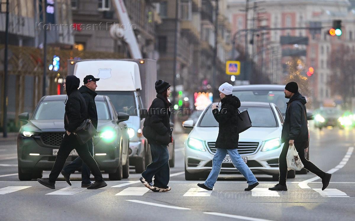 Жанровая фотография. Пешеходы переходят проезжую часть по наземному пешеходному переходу.