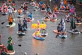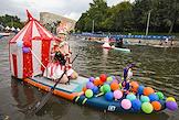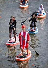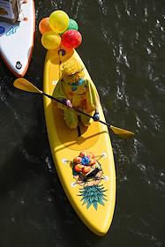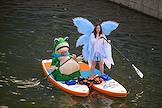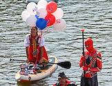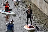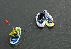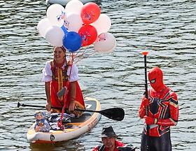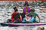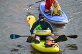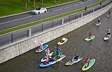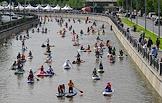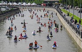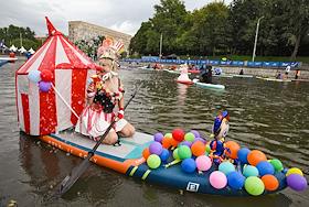САП-фестиваль "Яуза Фест". Карнавальный сап-заплыв на реке Яуза. Участники во время заплыва.