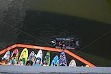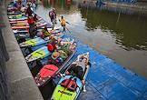 САП-фестиваль "Яуза Фест". Карнавальный сап-заплыв на реке Яуза. Участники на пристани перед началом заплыва.