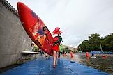 САП-фестиваль "Яуза Фест". Карнавальный сап-заплыв на реке Яуза. Участница после окончания заплыва.