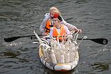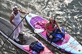 САП-фестиваль "Яуза Фест". Карнавальный сап-заплыв на реке Яуза. Участница во время заплыва.