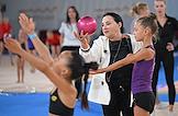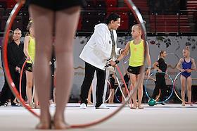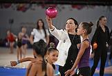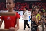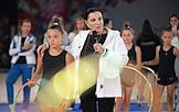 Мастер-класс тренера по художественной гимнастике Ирины Винер и звезд художественной гимнастики, приуроченный ко Дню физкультурника, во Дворце гимнастики Ирины Винер. Тренер по художественной гимнастике Ирина Винер (в центре) во время мастер-класса.