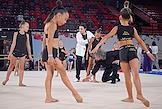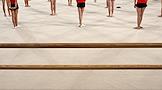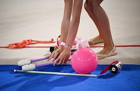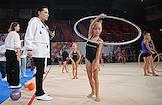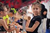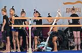 Мастер-класс тренера по художественной гимнастике Ирины Винер и звезд художественной гимнастики, приуроченный ко Дню физкультурника, во Дворце гимнастики Ирины Винер. Юные гимнастки перед началом мастер-класса.