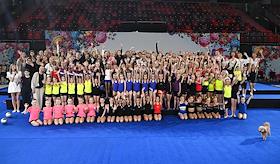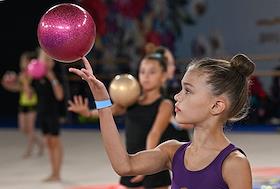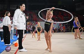 Мастер-класс тренера по художественной гимнастике Ирины Винер и звезд художественной гимнастики, приуроченный ко Дню физкультурника, во Дворце гимнастики Ирины Винер. Юные гимнастки во время мастер-класса.