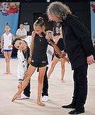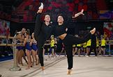 Мастер-класс тренера по художественной гимнастике Ирины Винер и звезд художественной гимнастики, приуроченный ко Дню физкультурника, во Дворце гимнастики Ирины Винер. Гимнастки Полина Орлова (слева) и Лала Крамаренко (справа) во время мастер-класса.