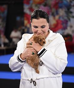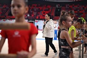 Мастер-класс тренера по художественной гимнастике Ирины Винер и звезд художественной гимнастики, приуроченный ко Дню физкультурника, во Дворце гимнастики Ирины Винер. Тренер по художественной гимнастике Ирина Винер перед началом мастер-класса.