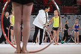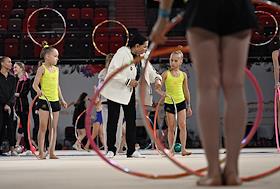 Мастер-класс тренера по художественной гимнастике Ирины Винер и звезд художественной гимнастики, приуроченный ко Дню физкультурника, во Дворце гимнастики Ирины Винер. Тренер по художественной гимнастике Ирина Винер (вторая слева) во время мастер-класса.