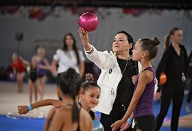 Мастер-класс тренера по художественной гимнастике Ирины Винер и звезд художественной гимнастики, приуроченный ко Дню физкультурника, во Дворце гимнастики Ирины Винер. Тренер по художественной гимнастике Ирина Винер во время мастер-класса.