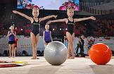 Мастер-класс тренера по художественной гимнастике Ирины Винер и звезд художественной гимнастики, приуроченный ко Дню физкультурника, во Дворце гимнастики Ирины Винер. Гимнастки Мария Кравцова (слева) и Алиса Тищенко (в центре) во время мастер-класса.