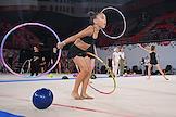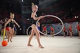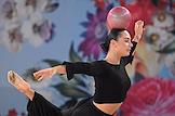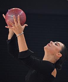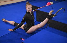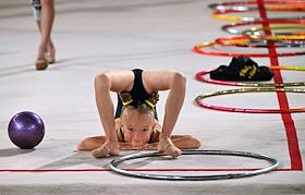 Мастер-класс тренера по художественной гимнастике Ирины Винер и звезд художественной гимнастики, приуроченный ко Дню физкультурника, во Дворце гимнастики Ирины Винер. Гимнастка Лала Крамаренко во время мастер-класса.