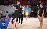 Мастер-класс тренера по художественной гимнастике Ирины Винер и звезд художественной гимнастики, приуроченный ко Дню физкультурника, во Дворце гимнастики Ирины Винер. Тренер по художественной гимнастике Ирина Винер (в центре) и гимнастка Алиса Тищенко (слева) во время мастер-класса.