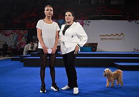 Мастер-класс тренера по художественной гимнастике Ирины Винер и звезд художественной гимнастики, приуроченный ко Дню физкультурника, во Дворце гимнастики Ирины Винер. Тренер по художественной гимнастике Ирина Винер (справа) и олимпийская чемпионка по фигурному катанию Анна Щербакова (слева) во время мастер-класса.