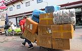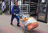 Торговый комплекс "Садовод". Жанровая фотография. Мужчина везет тележку с коробками.