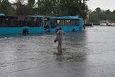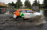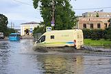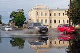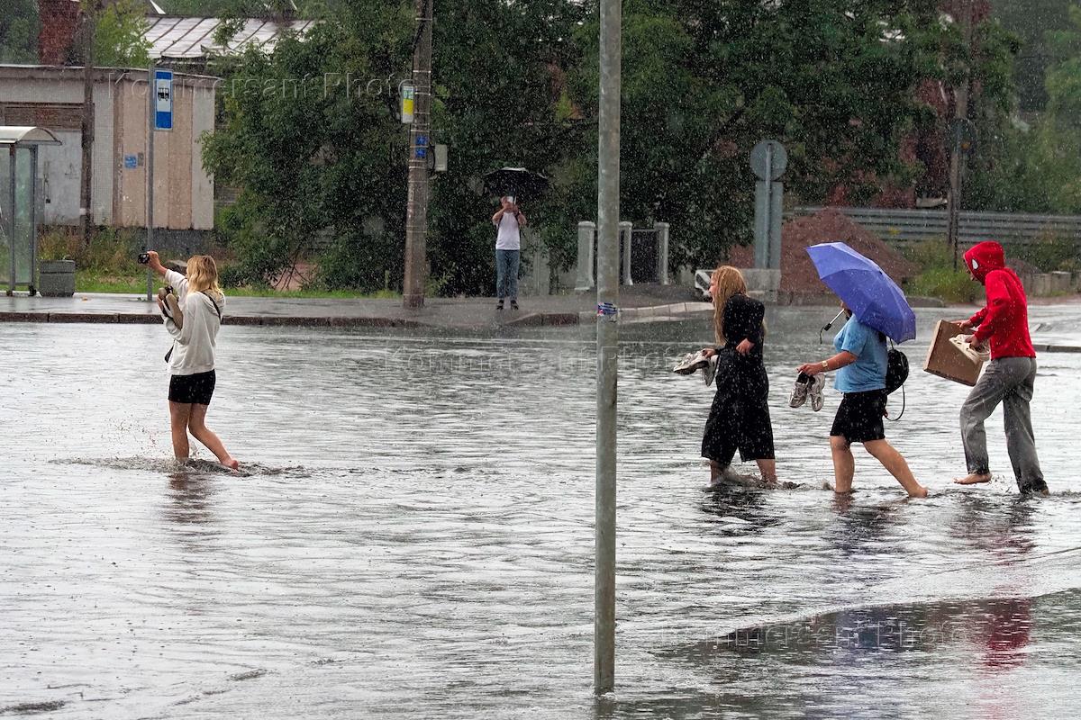 Жанровая фотография. Ливень в городе. Станция Ораниенбаум. Привокзальная площадь железнодорожной станции Ораниенбаум после дождя. Разлив воды на проезжей части.