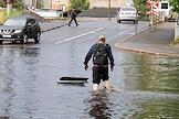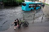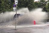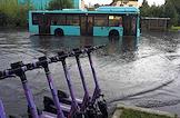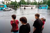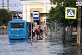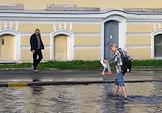 Жанровая фотография. Ливень в городе. Станция Ораниенбаум. Привокзальная площадь железнодорожной станции Ораниенбаум после дождя. Разлив воды на проезжей части и тротуаре.