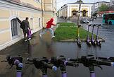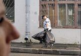 Жанровая фотография. Ливень в городе. Станция Ораниенбаум. Привокзальная площадь железнодорожной станции Ораниенбаум после дождя. Женщина несет мусорные пакеты.
