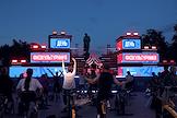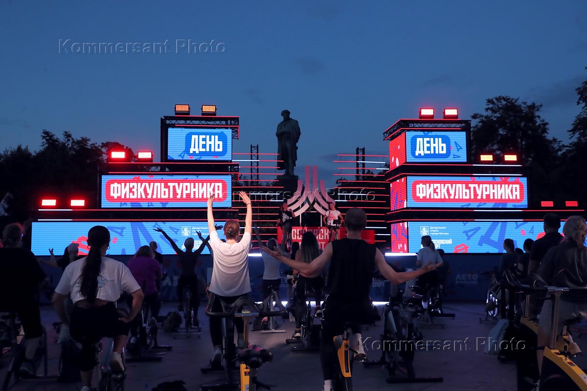 Спортивный фестиваль "День Физкультурника" в Москве. Соревнования по сайклу на Пушкинской площади.