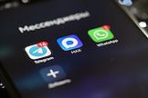 Жанровая фотография. Значки мобильных приложений мессенджеров Telegram, MAX, WhatsApp на экране смартфона.