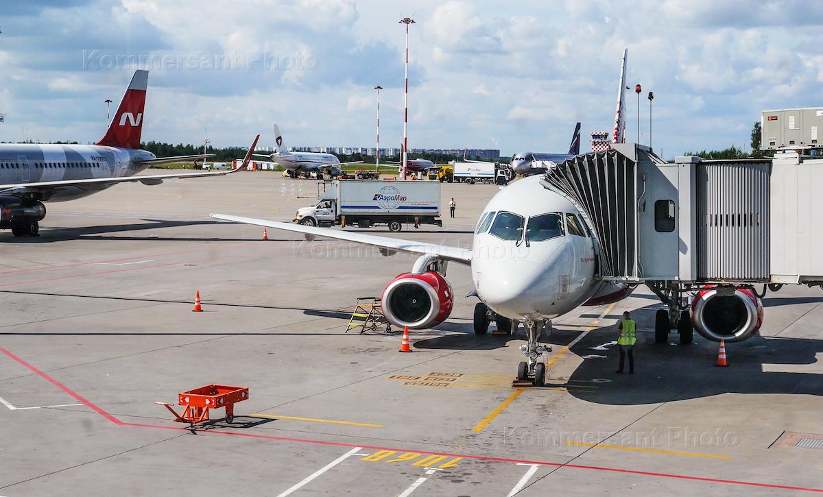 Международный аэропорт Пулково. Жанровая фотография. Самолет авиакомпании Smartavia у телескопического трапа (телетрап, "рукав").