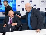 Пресс-конференция, посвященная подведению итогов приемной кампании в творческие учебные заведения, в пресс-центе ТАСС. Ректор ГИТИСа Георгий Заславский (слева) и ректор ВГИКа Владимир Малышев (справа) во время пресс-конференции.