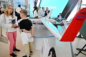 Международный форум "Беспилотные системы: технологии будущего" в инновационном центре "Сколково". Выставка беспилотных летательных аппаратов (БПЛА). Посетители на выставке.