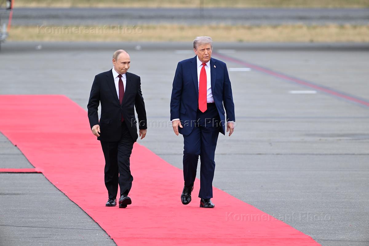 Встреча президента России Владимира Путина и президента США Дональда Трампа на базе Военно-воздушных сил "Элмендорф-Ричардсон". Президент России Владимир Путин (справа) и президент США Дональд Трамп (слева) на летном поле на аэродроме базы "Элмендорф-Ричардсон".