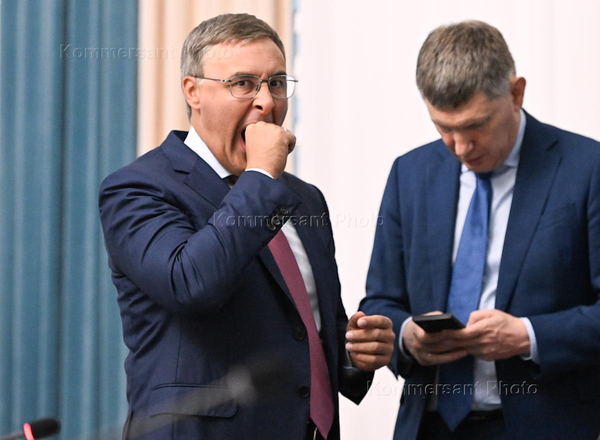 Официальный визит председателя правительства России Михаила Мишустина в Киргизию. Встреча председателя правительства России Михаила Мишустина с первым вице-президентом Ирана Мохаммадом Резой Арефом на полях заседания Евразийского межправительственного совета в резиденции "Чолпон-Ата". Министр науки и высшего образования России Валерий Фальков (слева) и министр экономического развития России Максим Решетников (справа) перед началом встречи.