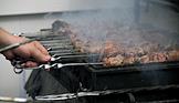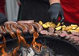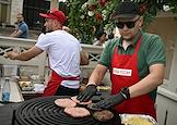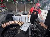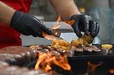 Гастрономический фестиваль "Вкусы России" на территории ВДНХ. Жанровая фотография. Приготовление шашлыков в одном из павильонов ресторанного дворика.