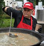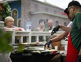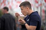 Гастрономический фестиваль "Вкусы России" на территории ВДНХ. Жанровая фотография. Приготовление блюд на фестивале. Посетитель фестиваля во время еды.