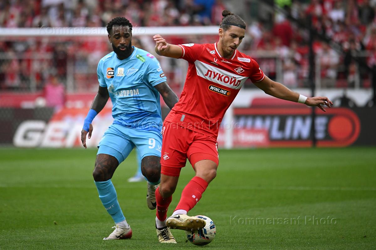 Мир Российская Премьер-Лига (РПЛ) 2025/2026. 5-й тур. Матч между командами "Спартак" (Москва) - "Зенит" (Санкт-Петербург) на стадионе "Лукойл Арена". Игрок команды "Зенит" Матео Кассерра (в центре) и игрок команды "Спартак" Руслан Литвинов (справа) во время матча.