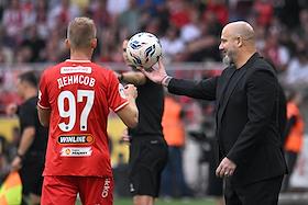 Мир Российская Премьер-Лига (РПЛ) 2025/2026. 5-й тур. Матч между командами "Спартак" (Москва) - "Зенит" (Санкт-Петербург) на стадионе "Лукойл Арена". Главный тренер команды "Спартак" Деян Станкович (справа) и игрок команды "Спартак" Даниил Денисов (слева) во время матча.
