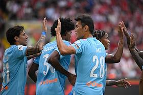 Мир Российская Премьер-Лига (РПЛ) 2025/2026. 5-й тур. Матч между командами "Спартак" (Москва) - "Зенит" (Санкт-Петербург) на стадионе "Лукойл Арена". Игроки команды "Зенит" во время матча.