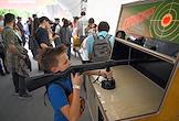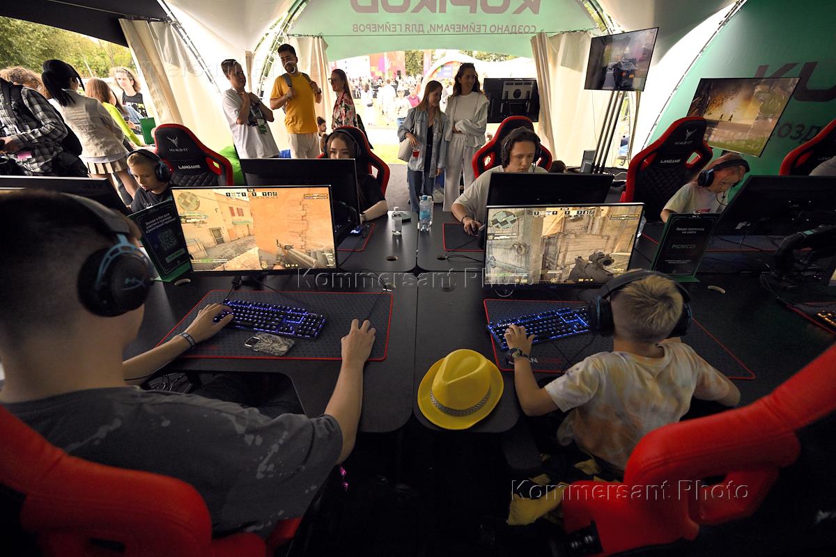 Семейный фестиваль для опытных ИТ-специалистов "ИТ-Пикник 2025" в музее-заповеднике "Коломенское". Жанровая фотография. Участник играет на игровом автомате "Снайпер".