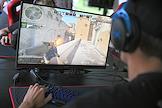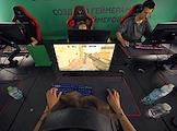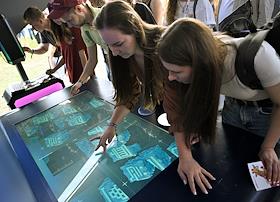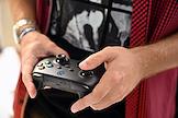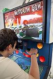 Семейный фестиваль для опытных ИТ-специалистов "ИТ-Пикник 2025" в музее-заповеднике "Коломенское". Жанровая фотография. Участник фестиваля играет на игровом автомате "Морской бой".