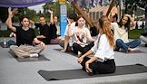 Семейный фестиваль для опытных ИТ-специалистов "ИТ-Пикник 2025" в музее-заповеднике "Коломенское". Участники фестиваля во время занятия йогой. Жанровая фотография.
