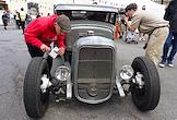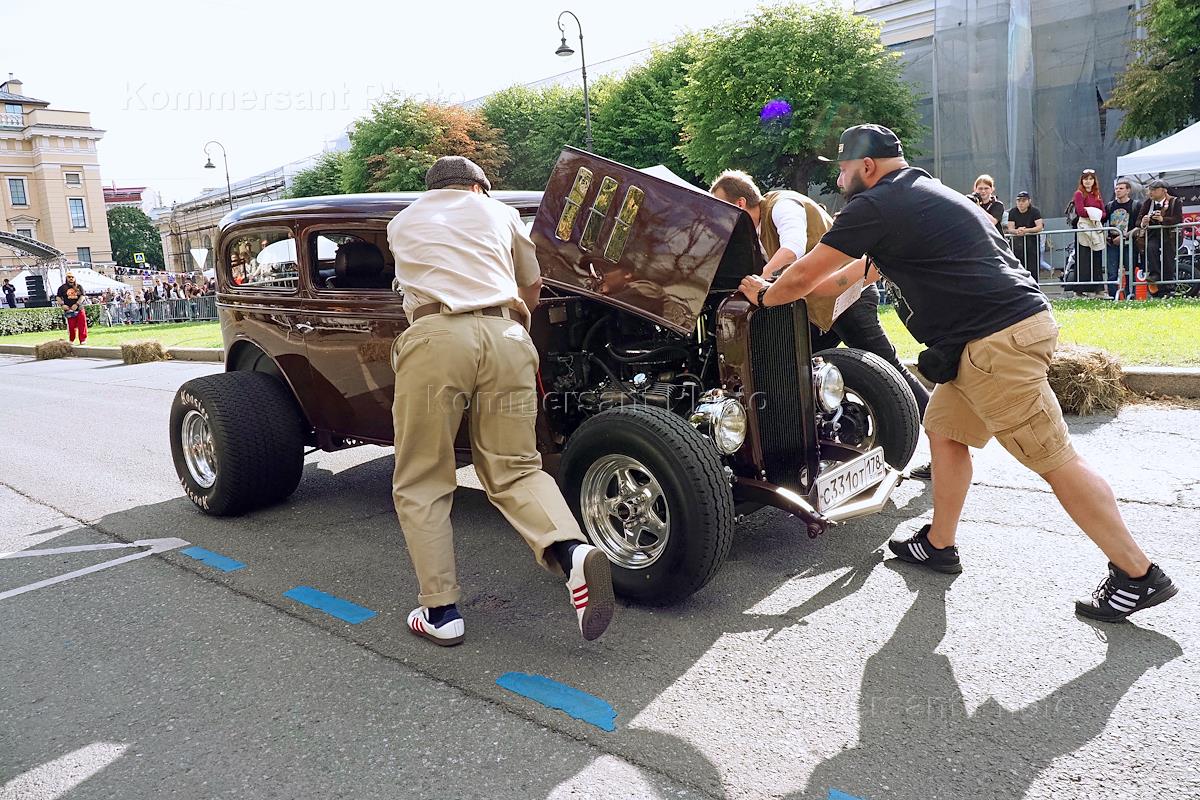 Фестиваль "Мотостолица-2025" на Манежной площади в Санкт-Петербурге. Шоу моторов, состоящее из 100-метровых парных заездов ретро автомобилей. Участники во время выступления.