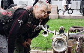 Фестиваль "Мотостолица-2025" на Манежной площади. Члены байкерского клуба "Ночные волки" на фестивале.